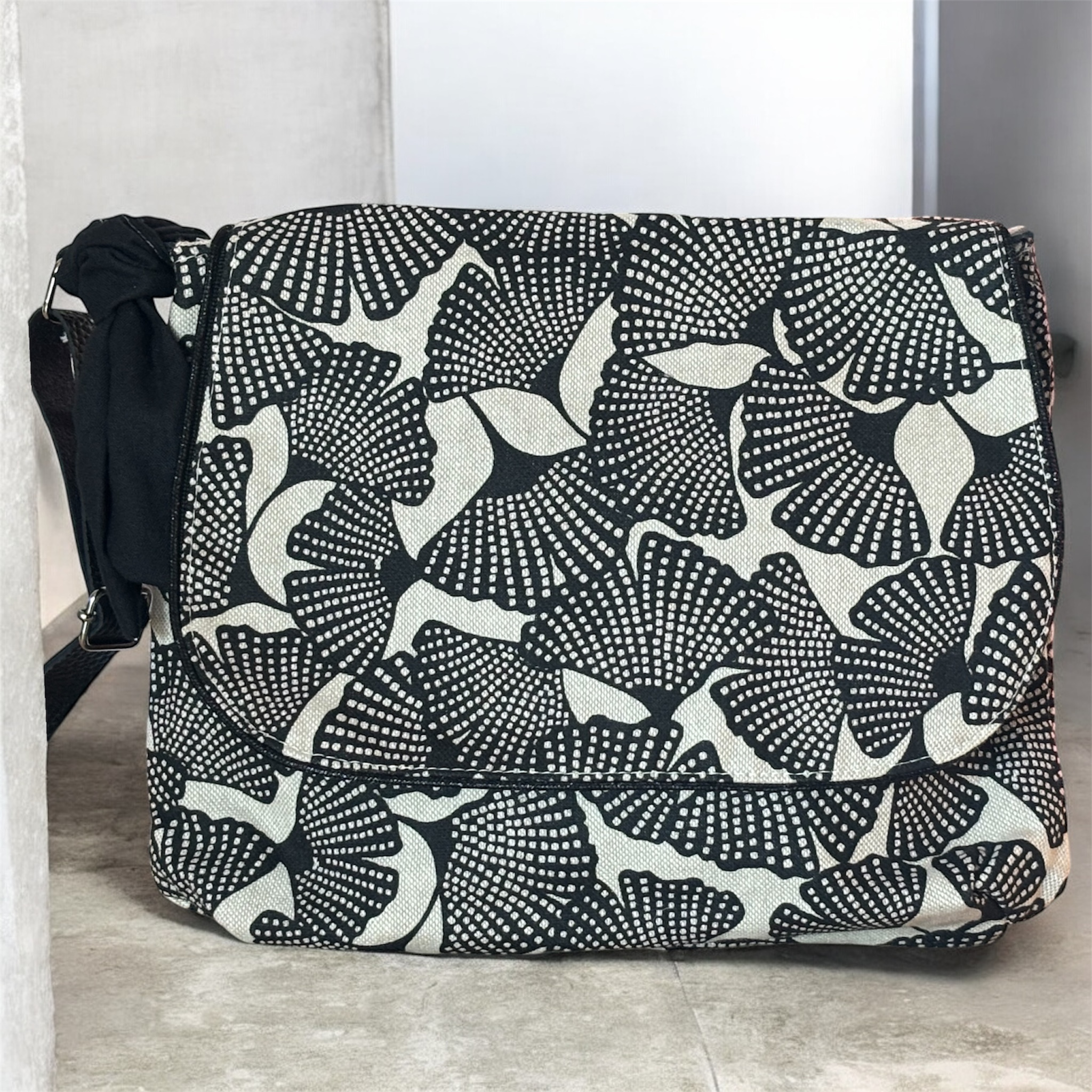 Confectionné avec soin dans mon atelier, le sac besace est réalisé en toile de coton, avec un motif graphique d’inspiration japonaise composé de formes stylisées rappelant des feuilles de ginkgo. Ce motif apporte du caractère au sac tout en conservant une esthétique élégante et intemporelle. Le sac est doté d’une anse en cuir synthétique réglable, afin de s’adapter facilement à chaque morphologie et à chaque façon de le porter.