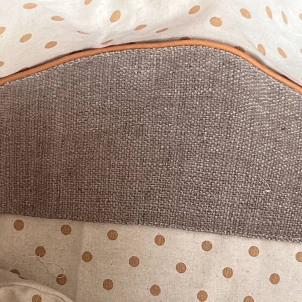 À l'intérieur, découvrez une doublure en coton à pois dans les tons beige et sable, qui ajoute une touche ludique et rétro à ce sac déjà irrésistible. Cette association de motifs et de couleurs crée un effet visuel dynamique, évoquant un style bohème-chic et décontracté.
