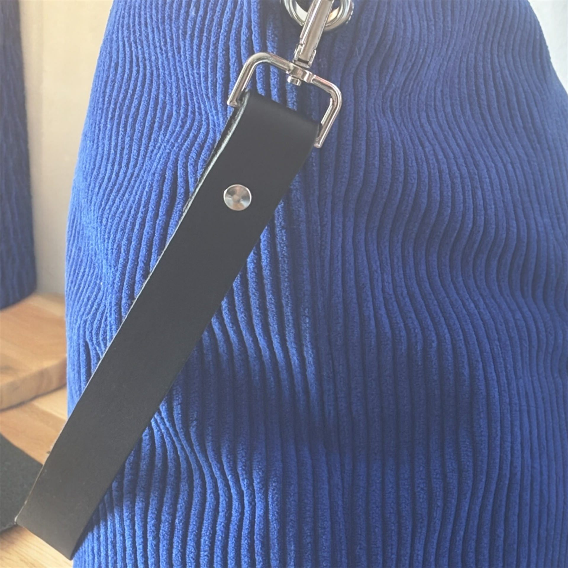 Le cabas “"P'tite poulette Collection" ” allie élégance et praticité avec son velours côtelé bleu et sa anse en cuir. Un sac raffiné, spacieux et plein de caractère, entièrement fabriqué à la main en France.