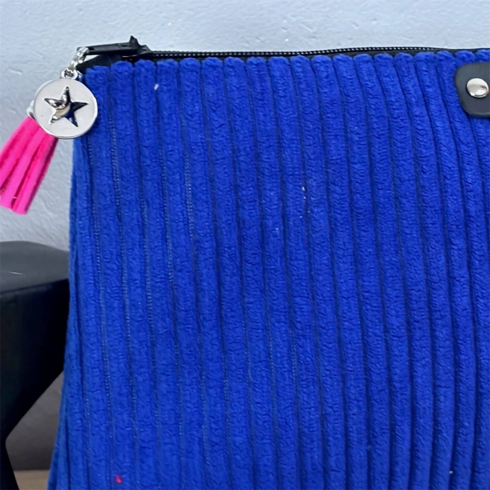 Cette trousse en velours côtelé bleu roi signée P’tite Poulette mêle élégance et originalité. Son tissu tissé aux motifs floraux colorés lui donne une allure à la fois joyeuse et raffinée, parfaite pour accueillir maquillage, bijoux ou accessoires du quotidien.