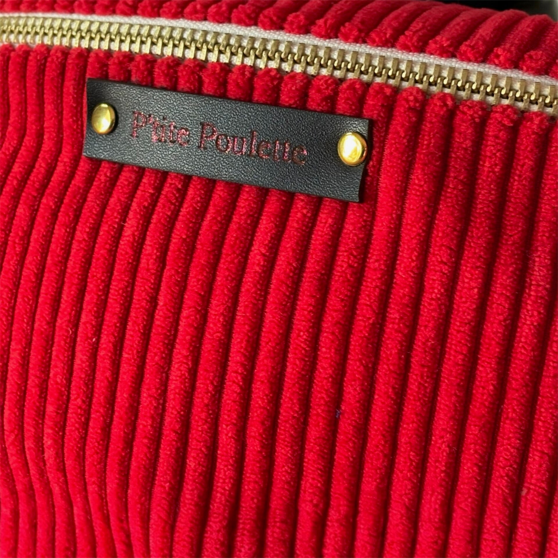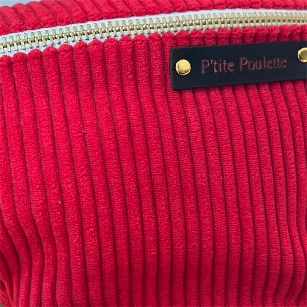 Banane en velours côtelé rouge vif, élégante et pratique avec sa anse réglable pailletée et sa poche zippée au dos. Confection artisanale française signée P’tite Poulette.
