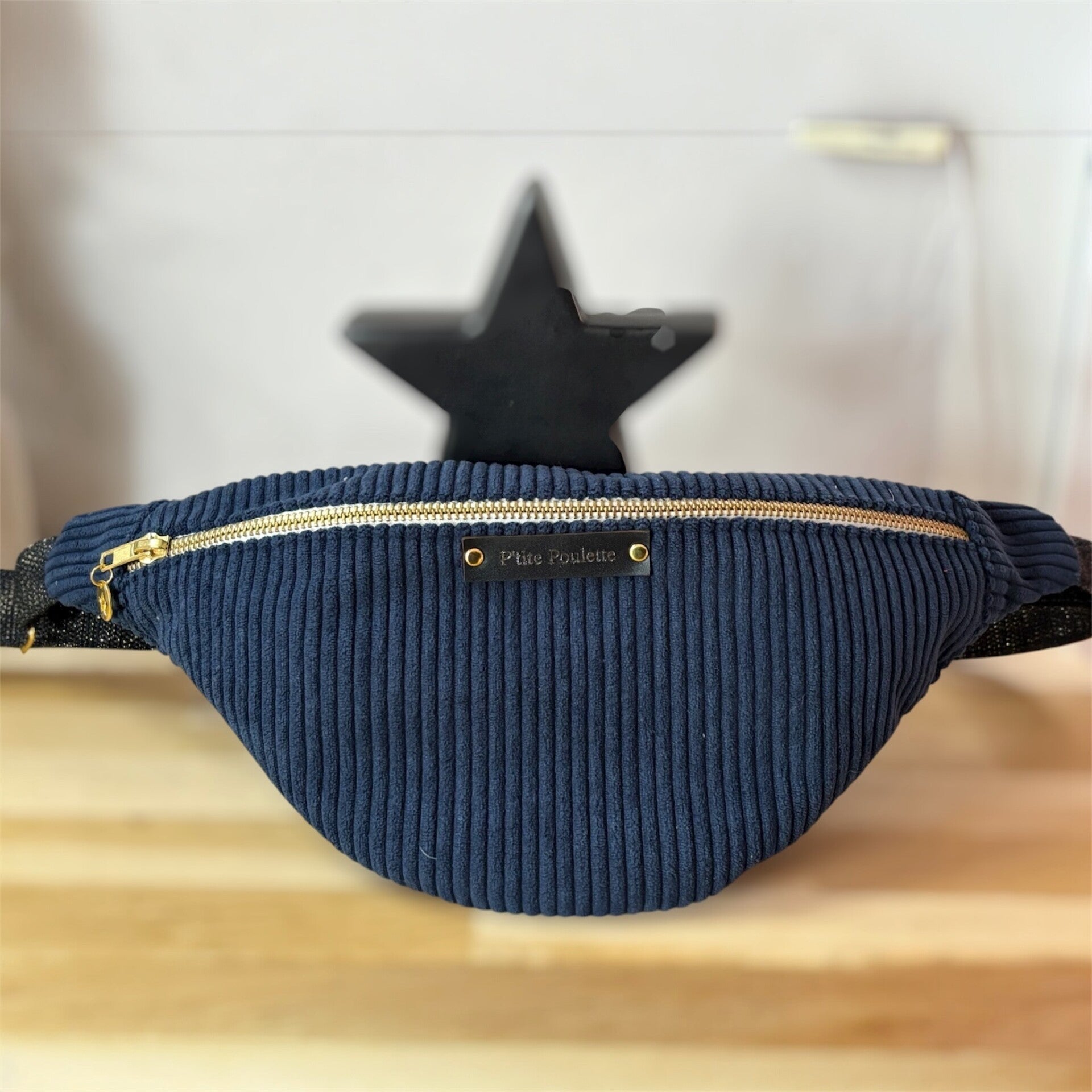 Banane en velours côtelé bleu marine, élégante et pratique avec sa anse réglable pailletée et sa poche zippée au dos. Confection artisanale française signée P’tite Poulette.